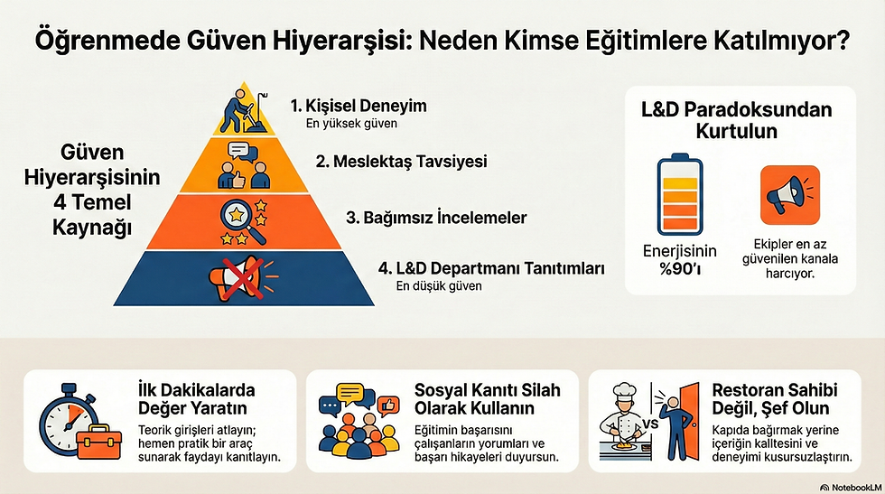 Buradaki paradoks oldukça net: L&D ekipleri genellikle enerjilerinin %90'ını en az güven duyulan (4. seviye) sinyallere harcarlar. Lansman mesajları, kurumsal videolar ve kendi kendini öven tanıtımlar... Oysa çalışanın gözünde bu, bir restoran sahibinin kapı önüne çıkıp "Yemeklerimiz şahane!" diye bağırmasından farksızdır.
